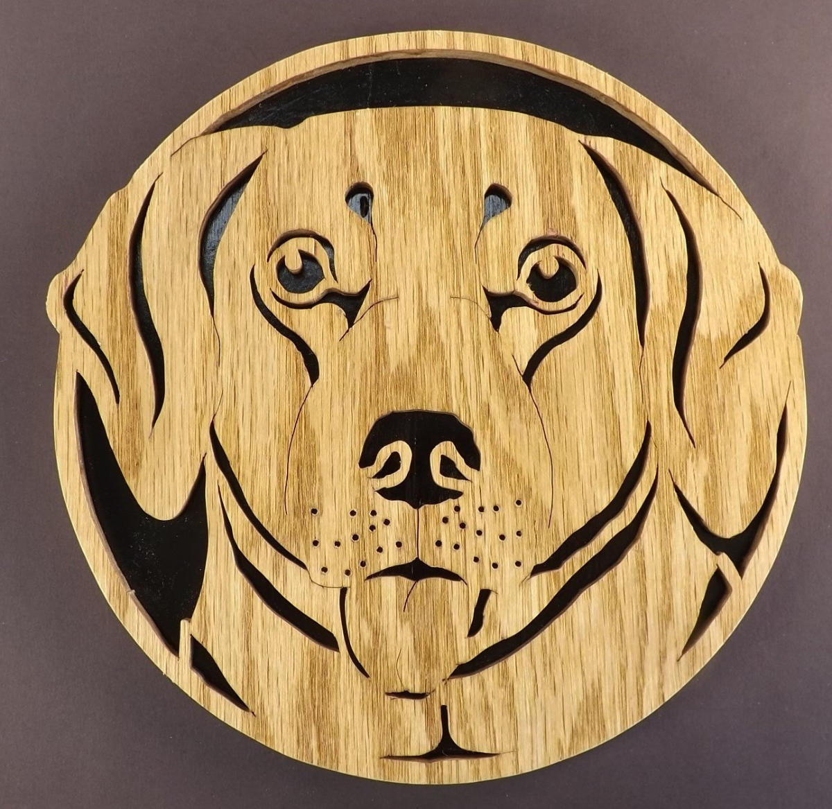 Scroll saw cutting of a Labrador Retriever wall display.