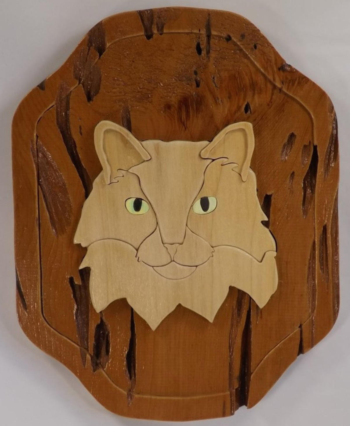 This intarsia wood art is made from cedar, cypress and